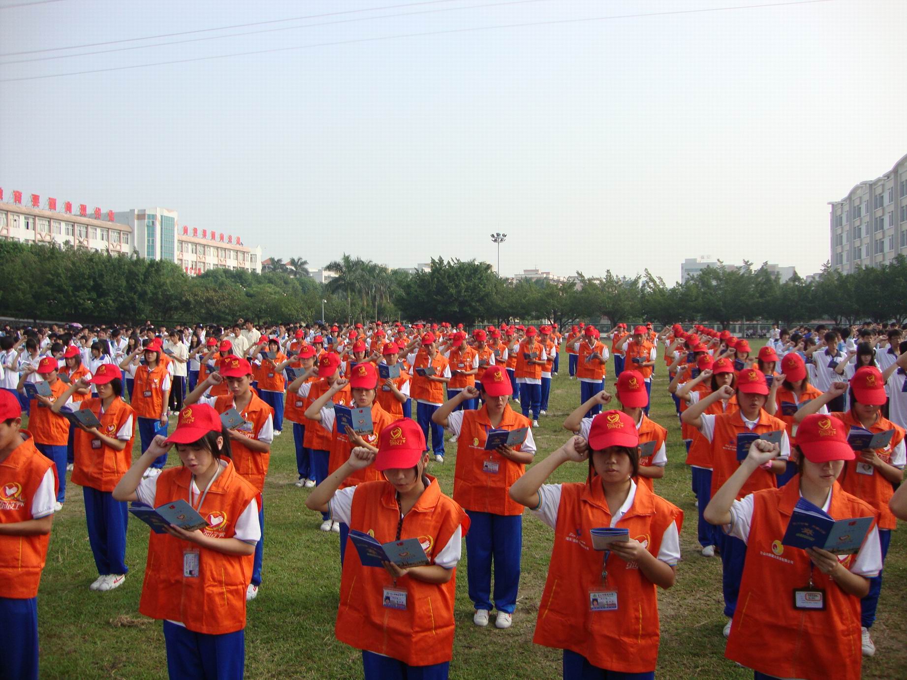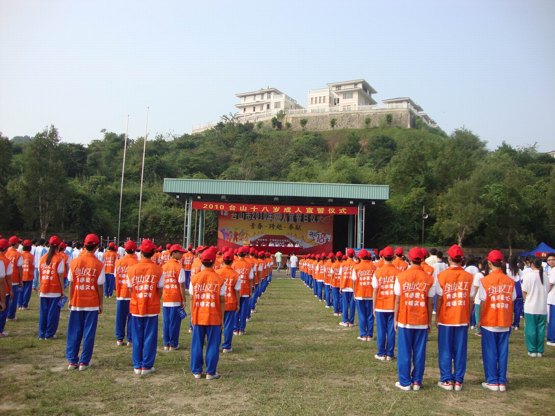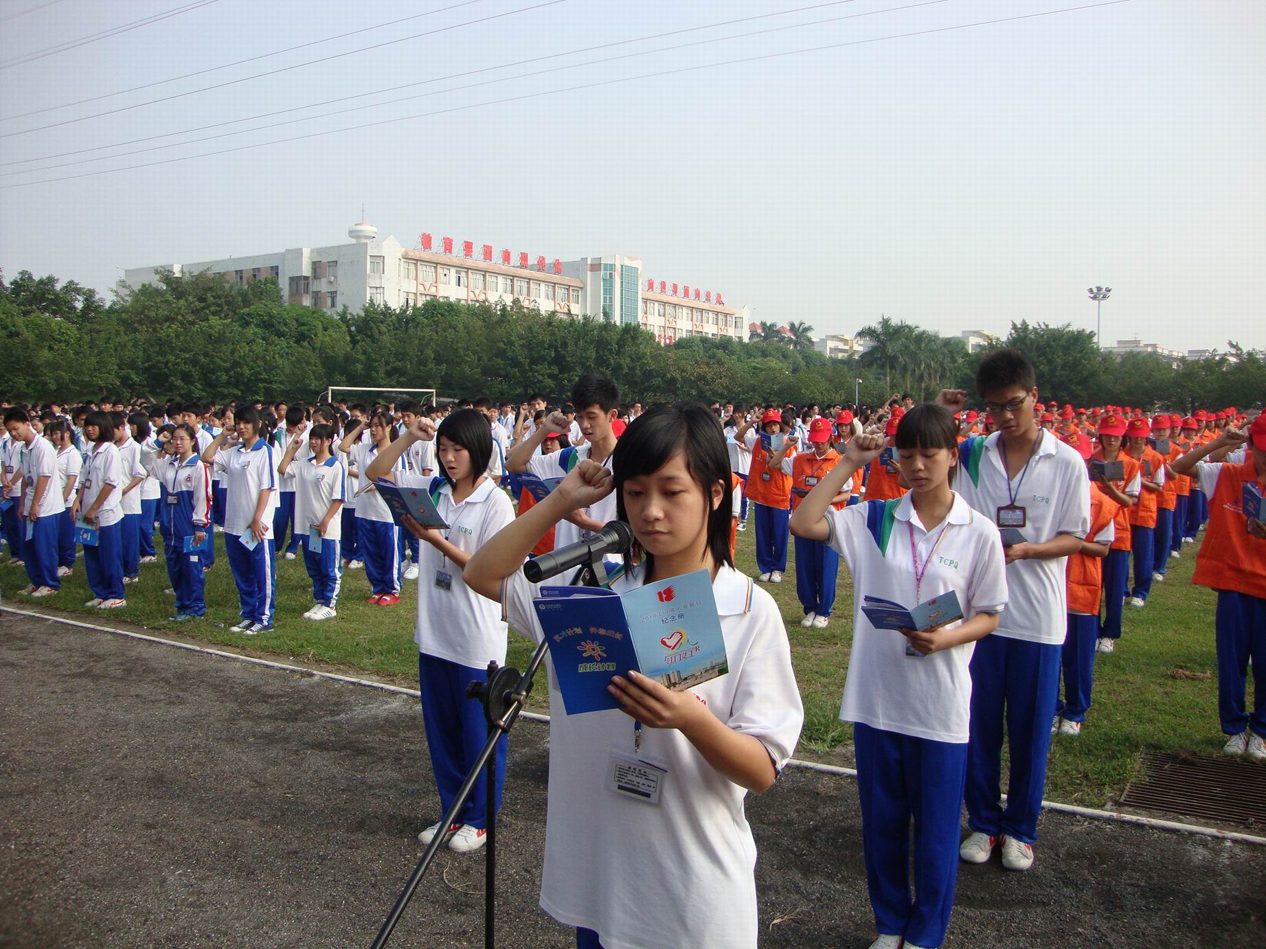 为了贯彻落实《公民道德建设实施纲要》、《中共中央国务院关于进一步加强和改进未成年人思想道德建设的若干意见》,不断增强青少年的公民意识和社会责任感,进一步发挥十八岁成人教育活动在中学生思想道德建设中的独特作用,使其成为开展对青少年进行现代公民教育、文明礼仪教育、道德品格教育的重要手段。团市委、市教育局、市精神文明办于10月18日在鹏权中学隆重举行了2010年台山市成人宣誓仪式。市人民政府副市长程学斌、市委宣传部副部长赵清波、团市委书记李国超、副书记柯嘉妮、市教育局副局长黄品亮、党委委员吴振文及主办单位、协办单位的有关领导和台城地区2010名十八岁学生一起参加了此次活动。