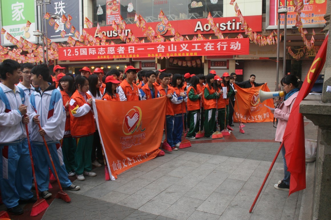 “传递爱心,传播文明”,为庆祝12.5国际志愿者日,发扬“奉献、友爱、互助、进步”的义工精神,市义工联联合市城市管理局于12月5日上午在台山商业城和步行街举行了主题为“12.5国际志愿者日——台山义工在行动”大型环保宣传活动。