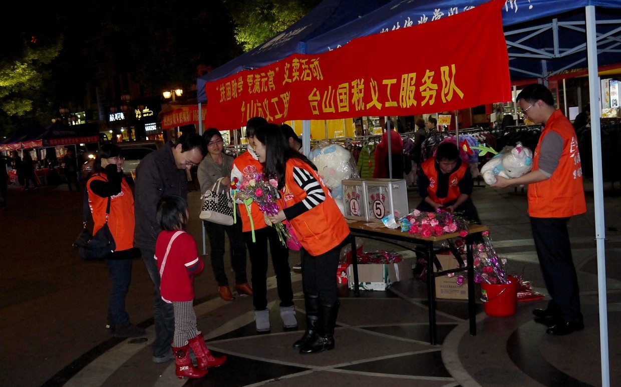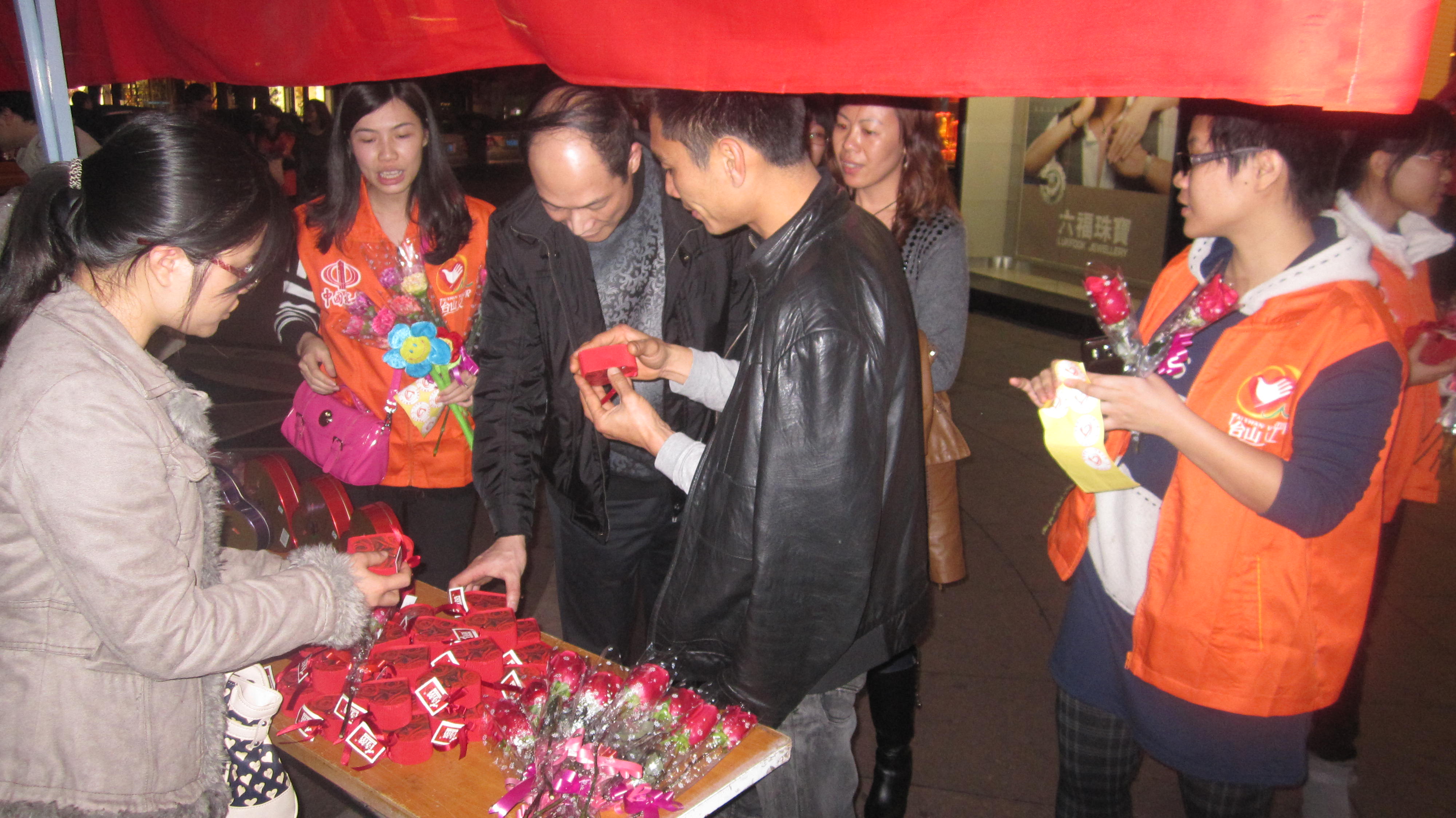 参加此次爱心义卖活动的有国税局义工服务队和社会义工共40多人。活动分别在商业城正门口、步行街、天岭广场等设置5个点进行爱心玫瑰、爱心巧克力、爱心毛公仔等义卖。