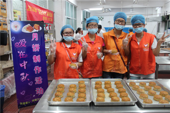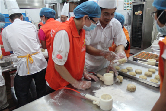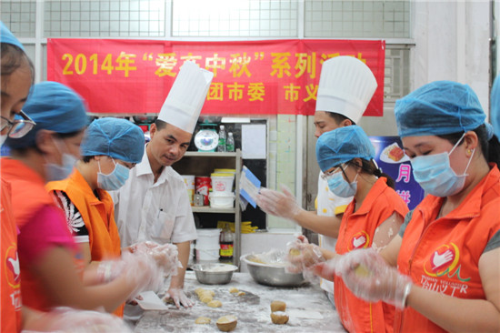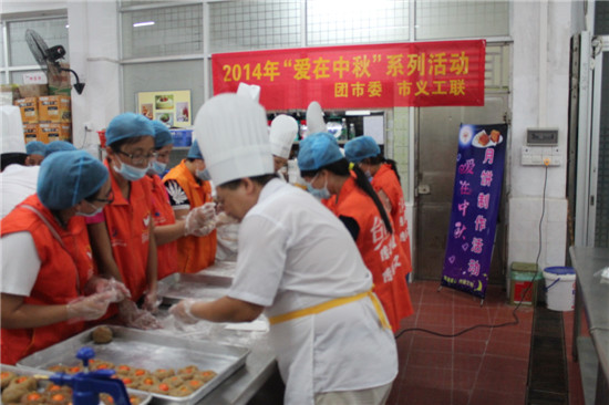 在中秋佳节来临之际,为了让困难家庭能过上一个快乐祥和的节日, 9月3日晚上,市义工联组织了10多名义工前往广东厨艺技术学院开展“爱在中秋”——爱心月饼制作活动,制作的月饼将送往低保家庭、孤寡老人等弱势群体。
