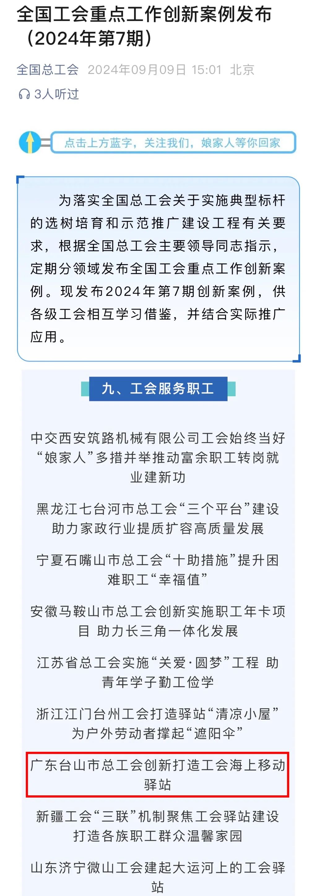 今天,全国总工会发布全国工会重点工作创新案例(2024年第7期),我市创新案例——“广东台山市总工会创新打造工会海上移动驿站”榜上有名。